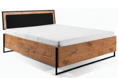 Łóżko Loft z kolekcji Sypialnie New Elegance w kolorze dąb Lancelot z czarnymi, wyrazistymi metalowymi ramkami.