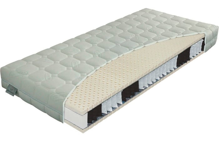 Materac: Sprężyna kieszeniowa, ponad 250 sprężyn/m ², harmonijnie reaguje na nacisk ciała, obustronnie przewiewna płyta lateksowa oraz siatka tapicerska - H2, przekładka tapicerska- H3.