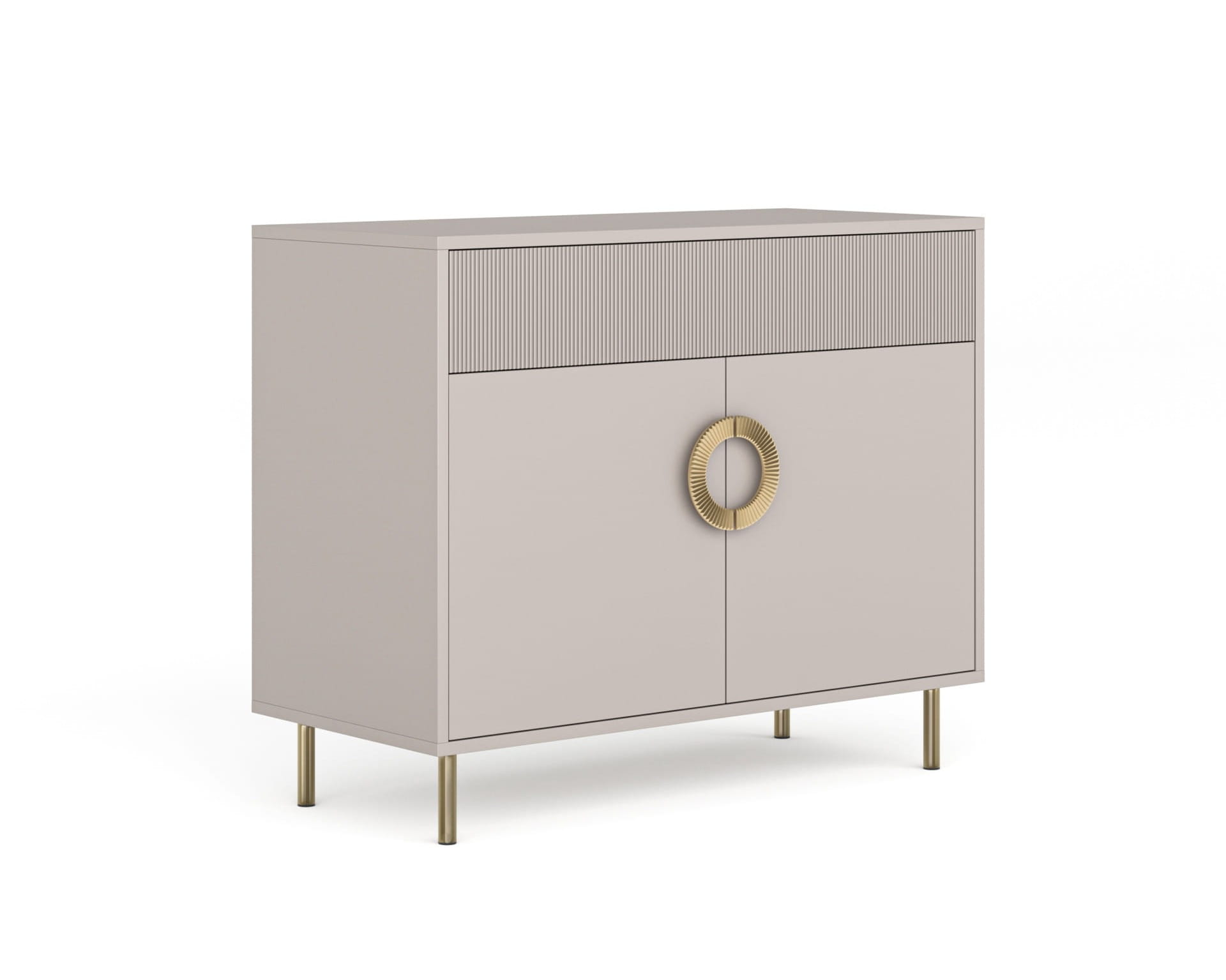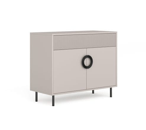 Komoda NUBO z płyty laminowanej i MDF o grubości 1,8 cm w pastelowym kolorze kaszmiru. Modny, ryflowany w drobne prążki front szuflady nawiązuje do ryflowania na dużych, ozdobnych uchwytach w kolorze matowego złota. Dostępne także uchwyty czarne . Złote nóżki lub czarne korespondują z kolorem uchwytów. Komoda posiada uchwyty z systemem cichego domyku i prowadnice push&pull.