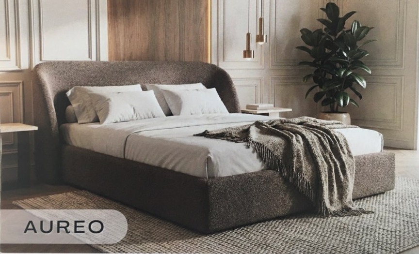 Łóżko AUREO z kolekcji New Elegance. Eleganckie, wytworne łóżko z zaokrąglonym i otulającym wezgłowiem. Miękkie linie zagłówka korespondują z zaokrągleniami podstawy.