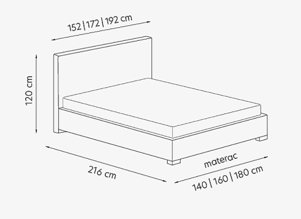 Łóżko dostępne w wersji bez pojemnika (opcjonalnie komplet stelaży za dopłatą), ale także z pojemnikiem, do którego dołączono podnoszoną ramę metalową na podnośnikach gazowych z już wbudowanym stelażem. Wymiary całkowite łóżka: