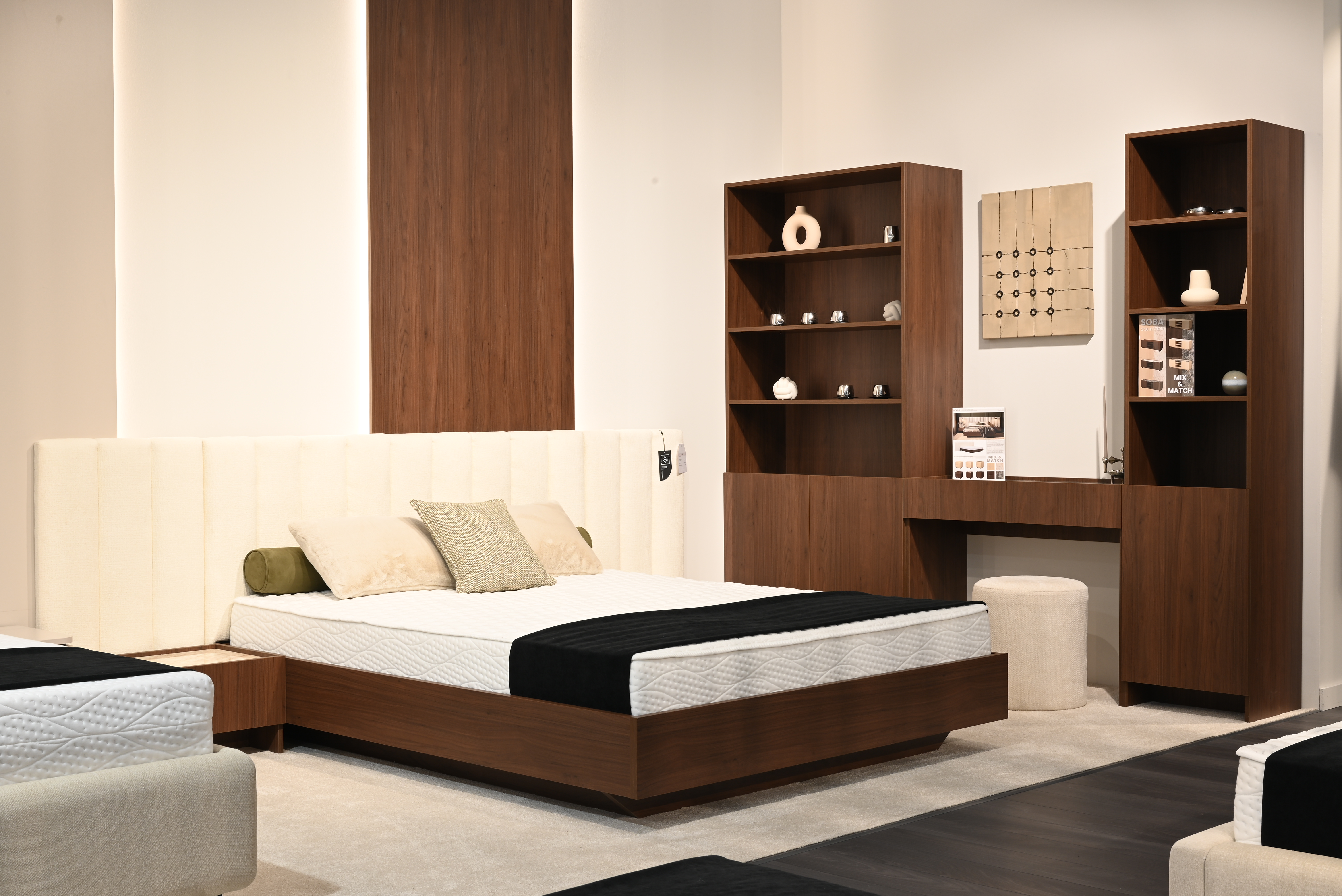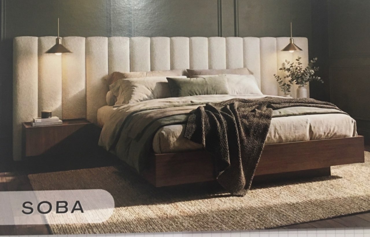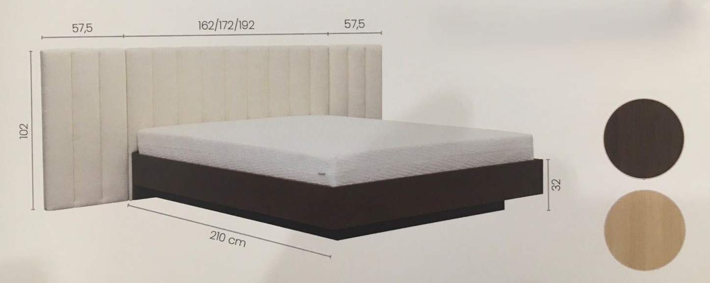 Łóżko Soba z kolekcji New Elegance. Lewitujące łóżko z płyty laminowanej z tapicerowanym wezgłowiem o pow. spania 160x200, z pojemnikiem. Opcjonalne dodatkowe tapicerowane panele boczne. W celu ustalenia ceny paneli bocznych prosimy o kontakt z Salonem.