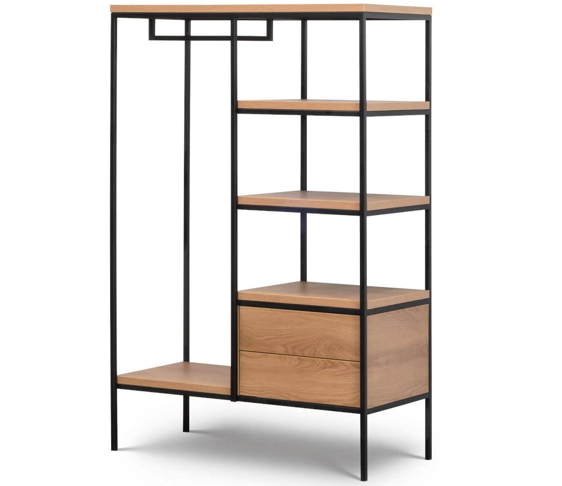 Regał LOFT karmel z szufladami, półkami i metalowym drążkiem na wieszaki w loftowym stylu. Wykonany z matowej laminowanej płyty meblowej w kolorze Dąb karmel doskonale imitującej naturalne drewno + czarny metal . Fronty wykonane z płyty laminowanej o grubości 1,8 cm, korpus z płyty o grubości 2,8 cm. Szuflady zamykane systemem push & pull.