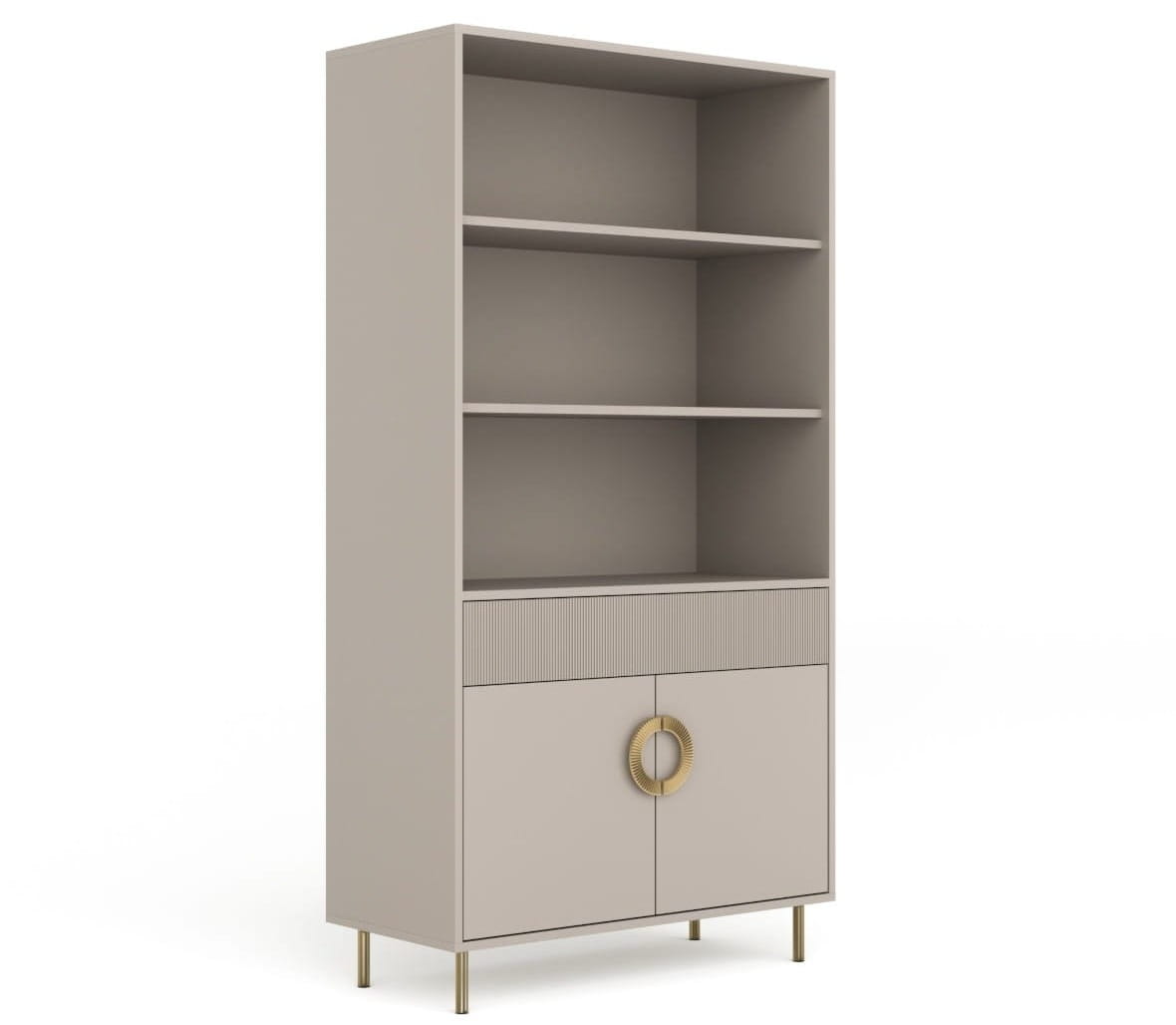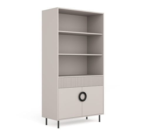 Regał NUBO z płyty laminowanej i MDF o grubości 1,8 cm w pastelowym kolorze kaszmiru. Modny, ryflowany w drobne prążki front dolych drzwi nawiązuje do ryflowania na dużych, ozdobnych uchwytach w kolorze matowego złota. Uchwyt dostępny także w kolorze czarnym. Złote nóżki lub czarne korespondują z kolorem uchwytów. Regał posiada uchwyty z systemem cichego domyku i prowadnice push&pull.