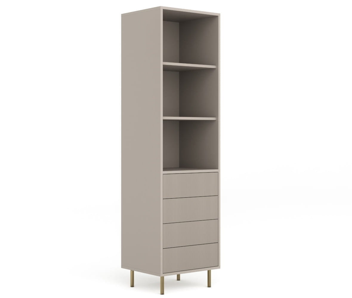 Korpus regału NUBO wykonany jest z płyty laminowanej o grubości 1,8 cm, fronty szuflad z płyty MDF ryflowanej o grubości 1,8 cm, w kolorze pastelowego kaszmiru. Dostępne nóżki złote lub czarne. Komoda posiada prowadnice z systemem push&pull.