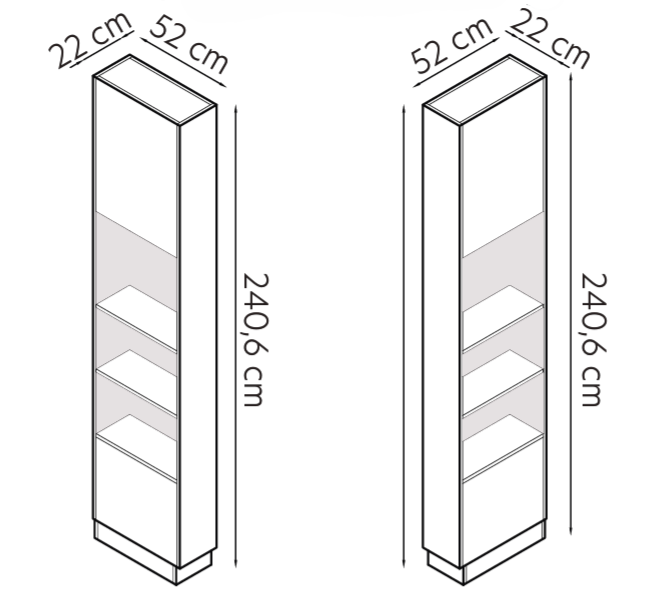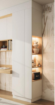 Regał końcowy z kolekcji New Elegance. Element kończący zabudowę Sleep Varia z wygodnymi półkami i szufladami. Dolna szafka otwiera się od przodu oraz od góry.