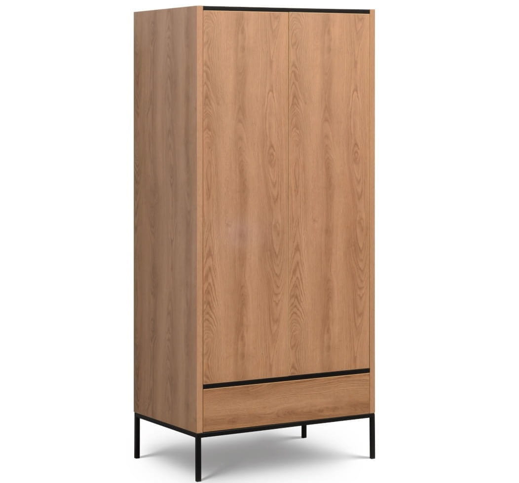 Szafa LOFT karmel - dwudrzwiowa. Wykonana z bardzo szlachetnej matowej płyty w stylu industrialnym, w kolorze miodowego dębu , doskonale imituje drewno naturalne. Czarna, metalowa ramka połączona z nóżkami koresponduje z dwiema poziomymi, czarnymi liniami oddzielającymi szuflady od drzwi i dekorującymi górny wieniec. Wewnątrz drążek i kilka praktycznych półek. Otwieranie szafu push& pull.